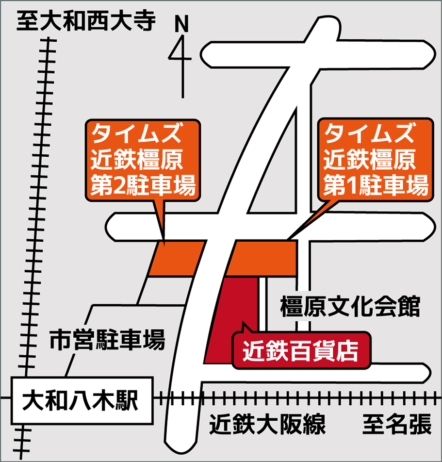 | 駐車場 | 橿原店立体駐車場(約400台収納) タイムズ近鉄橿原駐車場(約300台収納) |